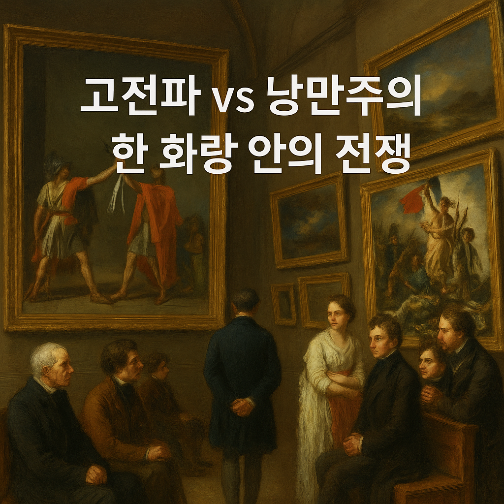 근대서양미술사는 단지 서양 회화의 스타일 변화를 기록하는 학문이 아니다. 계몽주의, 혁명, 산업화 등의 사회 변화와 밀접하게 맞닿아 있다. 특히 18세기 말에서 19세기 초는 고전파(신고전주의)와 낭만주의가 충돌하면서, 예술뿐 아니라 시대정신 전체가 격변하던 시기였다. 이 대립은 마치 “한 화랑 안의 전쟁”처럼, 같은 전시장 안에서 서로 다른 극단의 양상을 드러냈다.
