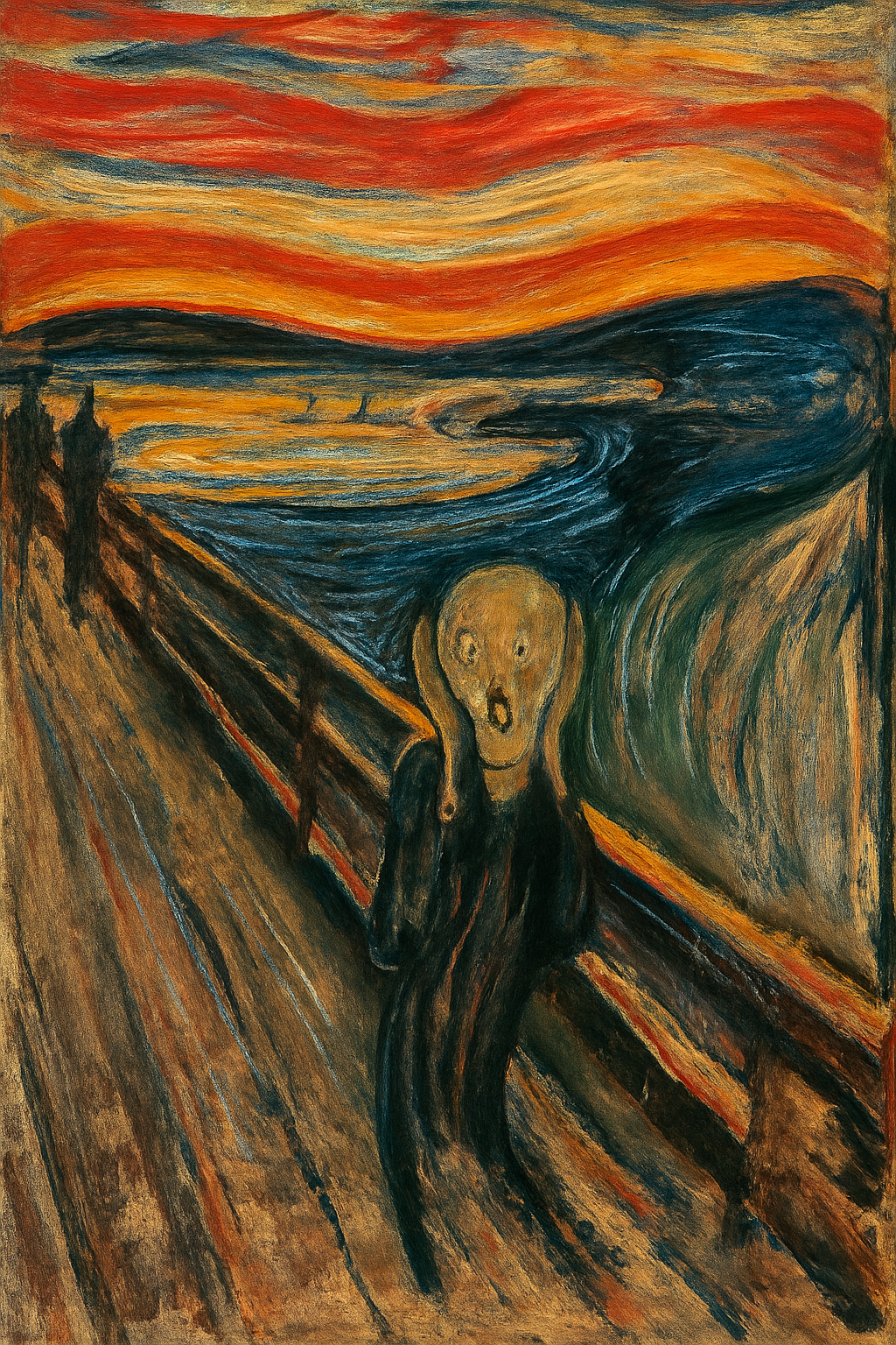 이는 뭉크 자신이 겪은 심리적 고통, 즉 ‘panic attack’으로 해석되며, 단순한 풍경 모사가 아니라 내면의 불안이 그려진 장면임을 암시한다.